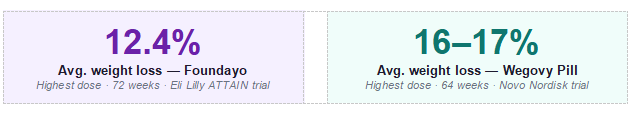 Note on safety data: The Wegovy pill (semaglutide) belongs to a drug class with over 20 years of human safety data. Foundayo uses a new small-molecule ingredient or forglipron with a shorter track record. Both the FDA and independent experts recommend continued monitoring as post-market safety data accumulates for Foundayo.